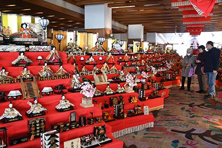 写真=ロビーにずらりと並ぶ雛人形
