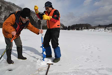 中綱湖穴釣り 今年も断念 大町 漁協が調査 氷薄く注意