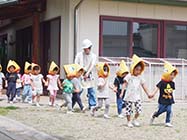 火災発生を知らせる放送を受け、保育士の誘導で、園児らは防災頭巾をかぶって速やかに園庭へ避難した。鳥羽健一署長が講評し、「避難にはスピードが大事。押さない、走らない、しゃべらない、戻らない≠気をつけて」と伝えた。