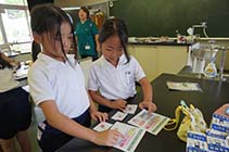大町市の大町西小学校で6日、2年生を対象に市立大町総合病院の歯科衛生士による、初の歯科指導が行われた。診療技術部・歯科衛生科の歯科衛生士・宮坂里津絵さんと、歯科衛生科長・傳刀仁美さんらが来校。児童が咀そしゃく嚼力判定ガムを使って自分の噛む力を知り、歯と口の健康づくりのため、よく噛んで食べることの大切さを学んだ。 |