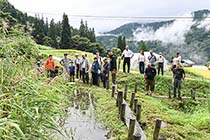 前日の雨と穂の重みで稲が倒れ気味の状態で行った。高橋さんは「本来はやらない(雨上がりの)コンディション」と前置きした上で、「田植えから景色が変わる。僕たち(農家)はお米を作っていると同時に景色を作っている。五感を感じながらやってみて」と伝えた。