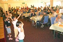 小谷村は17日、敬老会を白馬アルプスホテルで開催した。アトラクションや祝辞、祝いの品の贈呈などを行い参加者の健康長寿を祝った。約130人が参加し、食事を堪能しつつ、芸能ボランティア「せせらぎ」の民謡や踊り、村保育園年長児による元気いっぱいのダンスを楽しんだ。 |