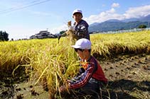 白馬村北城青鬼地区の棚田で27日、村特産の古代米「紫米」の稲刈り作業が行われた。秋晴れのもと、昔ながらの手作業での収穫に汗を流した。 |