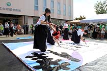 開会式の後に行われた大町岳陽高校書道部の書道パフォーマンスでは、部員が音楽に合わせて踊りながら大きな紙に「健やかな笑顔あふれる未来へ」と書き上げた。 |