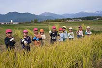 大町市社のどんぐり保育園の園児が3日、園近くの職員の田んぼで稲刈りを体験した。 園児に米作りの楽しさを知ってもらおうと行われている食育の一環。職員の協力を得て田んぼの隅の空いている場所を提供してもらい、近くの農家の佐藤忠さんから指導を受けながら、春に全員で田植えをした。 |