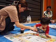 未就園児の親子を対象にした松川村公民館の社会教育学級「ももたろうきょうしつ」の5回目「アートであそぼう!」が7日、すずの音ホールで開かれた。大町市を拠点にアートを通して子どもたちの創作活動を支援する「みとろぐる〜ぷ」の三戸呂三都子代表らが講師となり、親子で伸び伸びとアートを楽しんだ。 |
