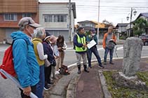 大町市社会福祉協議会は16日、「ふれあいバス利用大人の社会見学」を実施した。歴史に詳しい同市観光ボランティアの高橋博久さんを講師に、市民バス「ふれあい号」を使って、市街地北部の古道を歩き、水にまつわる文化財を見学。現代の豊かな水資源のある大町を育んだ、昔の人々の営みや歴史に思いをはせた。 |