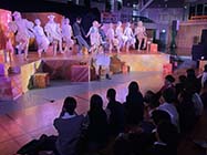 芸術文化に触れて表現力や感性を養ってもらおうと、白馬村の白馬中学校は23日、文化庁事業の一環でミュージカルの鑑賞会を協和ウイング白馬(ウイング21)アリーナで開いた。生徒約170人と保護者らが鑑賞し、プロの劇団よる演劇を堪能。表現と物語の世界に没頭した。 |