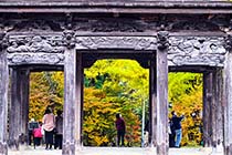 たおやかな秋の日差しに、カエデやツツジの紅色、朱色、黄色、山吹色などが綾をなし、荘厳な本堂や趣ある庫裏(くり)、県宝の山門を染める。ドウダンツツジの燃えるような赤は、ひときわ目に鮮やか。 |