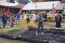大町市八坂の藤尾山覚音寺は2日、八坂情報コミュニティセンターアキツ前の広場で「採灯大護摩供」を執り行った。ヒノキの葉に覆われた「護摩壇」で護摩木をたく、野外で厳修する修験道の護摩祈祷。たき終えた護摩壇の火がくすぶる上を、修験者や参拝者らが裸足で歩き、家内安全や無病息災を願った。 |