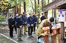 大町市内の酒蔵3社(三蔵)は7日、大町俵町の若一王子神社境内にある松尾社で「松尾様」の例祭を開いた。白馬錦酒造(白馬錦蔵元)、北安醸造(北安大国蔵元)、市野屋(市野屋蔵元)の三蔵から杜氏、蔵人の8人が参加した。