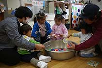 小谷村保育園で11日、来年度入園する未就園児と年中児の交流会が開かれた。お祭りをテーマに、年中児が縁日の催しを手作りし、法被を着てお出迎え。未就園児たちは、来年1年間一緒に園生活を送る「お兄さん、お姉さん」たちと楽しい時間を過ごした。 |