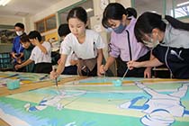 白馬村の白馬北小学校(児童数261人)は17日、校庭に新しく完成するジャンプ台に描く壁画の下絵に色を塗る作業を行った。全児童が参加し、筆と絵の具で下絵を色鮮やかに彩った。ジャンプ台は12月20日の完成セレモニーで壁画とともにお披露目し、今冬から利用する予定。自分たちで塗った絵が描かれたジャンプ台で飛ぶイメージを膨らませつつ、作業に没頭した。 |