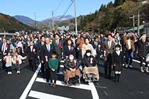 小谷村の国道148号雨中・月岡バイパスが16日、開通した。大型車両による村中心部の騒音や振動、交通事故の危険があった中で、地区内を迂回し、住民の安心安全を確保しつつ、スムーズな道路交通を可能とする。同日は開通式があり、地域住民や招待者、関係者ら約300人が参加。渡り初めで完成したばかりの道路を歩き、着工から11年、地域の悲願だった幹線道路の完成を祝った。 |