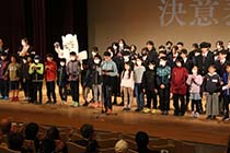 白馬村スキークラブの団結式と、村スポーツ功労賞、村スキースポーツ育成振興奨励金の授与式が14日、協和ウイング白馬(ウイング21)で開かれた。受賞者やクラブ会員ら約170人が出席。功労賞はスケートボードとスキー、スノーボードの大会で好成績を残した4人が受賞した。団結式ではスローガンの発表や選手の決意表明があり、今シーズンの健闘を誓った。 |