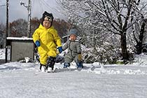 強い寒気の影響で県北部で雪が降り、19日は大町市平や白馬村、小谷村の平地で積雪した。小谷村では19 日正午までの24時間に5aの降雪を記録。日中は冬型の気圧配置が緩んで気温が上がり、ほとんどが解けてしまったものの、朝方には雪遊びをする子どもたちの姿が見られ、待望の雪を喜んだ。 |