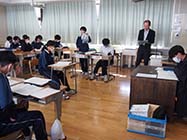 「コンビニ強盗―被告人は犯人か―」と題する用意されたシナリオをもとに、クラスごとに実施。法廷さながらに席を配置し、裁判官と検察官、被告人、弁護人、裁判員の役割を各自演じた。実際の裁判と同じ手順を踏み、冒頭手続き、証拠調べ手続き、弁論手続き、評議、判決の宣言まで行った。 |