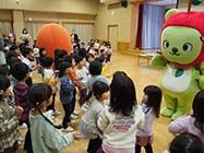 食の「地産地消」を推進する県は、園児を対象に、音楽やダンスを活用した食育活動を展開している。18日は、県農政部農業政策課農作物マーケティング室の職員らが松川村認定こども園を訪れ、地産地消の大切さを分かりやすく伝えた。