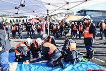訓練は施設2階の会議室から出火、施設職員が初期消火を試みるも鎮火せずに延焼してしまい、施設利用者にけが人がいる想定で実施した。消防団と消防署は合同で現場指揮本部を設営、消火活動の放水体制、延焼・類焼に備えての警戒体制配備、要救助者の現場救護所までの搬送、負傷者トリアージ、負傷者への応急処置などが行われた。 |