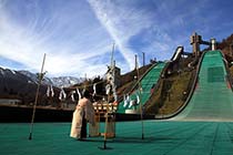 迫るスキーシーズンを前に、白馬村観光局と村索道事業者協議会は23日、村内スキー場の合同安全祈願祭を白馬ジャンプ競技場で開いた。索道事業者やパトロール、観光関係者など約70人が参加。一日も早い積雪を切望し、安全なシーズンの営業、多くの観光客の来村を神事で祈った。