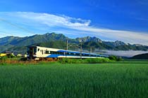 選出された13点は、松本市から糸魚川市までさまざまな角度から撮影。四季折々の風景や大糸線を走る車両の写真が出そろった。中には、今年3月のダイヤ改正により見ることができなくなった、信濃森上駅から白馬大池駅間(白馬村)を走る特急あずさと目の前に迫る北アルプスの貴重な写真なども選ばれた。表紙と各月に掲載となる。(写真は表紙に選ばれた山本宗治さん(東京都昭島市)の作品) |