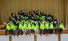 緑色のユニホームに身を包み、結団式に臨む選手たち。今季は小学生27人、中学生8人が所属し、アルペン、クロスカントリー、ジャンプの各競技で大会に出場する。 |