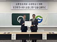 松川村は26日、山梨県南巨摩郡富士川町(望月利樹町長)と災害時などの相互応援に関する協定を結んだ。大規模災害時でも同時に被災しにくい一定距離離れた自治体と普段からの関係を深め、非常時への備えとなる交流の縁をつなぐ。須沢和彦村長が同町を訪れ、調印した。