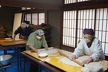 メンバーは早朝から集まり、大町産の新そば粉を使って、手際よくそばを打った。地場産のかき揚げや漬物も添え、招待されたお年寄りたちと味わった。 |