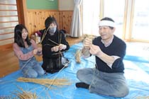 大町市大町北原町の若手有志でつくる青風会は7日、大町西小学校へ贈る毎年恒例のしめ縄作りを北原町公民館で行った。学校再編に伴う閉校を来春に控え、最後は児童にも日本の伝統に触れてもらおうと招待。長さ約6・5bの立派なしめ縄を一緒に作った。