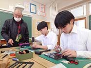 生徒たちは美麻ジビエ振興会の合津富吉会長らを講師に、シカ革のベルトを加工。硬い革に工具で縫製用の穴をあけ、リングと鈴を取り付けて、糸で縫い合わせていた。 |
