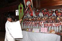 大町市大町俵町の若一王子神社で23日、来年の縁起物などを準備する年末恒例の神事「神符守札(しんぷしゅさつ)清め祓(はら)はらい入魂祭」が行われた。初詣の参拝客らに頒布するお守りや熊手、破魔矢など約130種2万体が並び、神職が一年間の平穏を願ってお清めをした。 |