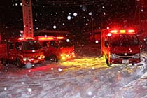 火災予防¥чで呼び掛け 小谷村消防団 大雪の中 年末警戒出発