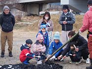 池田町池田三丁目の子ども会育成会・自治会は11日、恒例の三九郎を高瀬川大橋のたもとで開いた。寒風の中、約30人の住民が集まり、小正月の伝統行事に親しんだ。 |