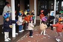 松川村の松川南保育園(榛葉啓子園長、園児113人)は3日、節分行事を開いた。お話や豆まきを通して、季節の行事に親しんだ。 |