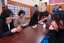 会は参観日に合わせ、「おうせんきょう小豆保存会の方々ありがとう。お家の方々は成長した姿を見ながら小豆蒸しパンを食べてくださいパーティー」と題して実施した。 |