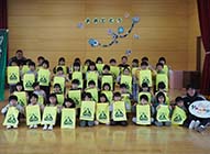 松本山雅FCホームタウンの池田町は、小学校に入学する子どもたちに毎年、山雅のオフィシャルマスコット「ガンズくん」と町のマスコット「てるみん・ふ〜みん」をデザインしたランドセルカバーを贈っている。山雅の小林陽介コーチと久保翔コーチは18日、認定こども園池田保育園を訪れ、年長児46人に交通安全を願うグッズをプレゼントした。 |