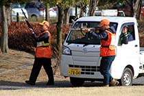 実地訓練では公園にクマが逃げ込んだ設定で、パネルで表現したクマに軽トラでハンターが近づき、銃で捕獲する一連の作業を再現し訓練した。住民の立ち入り禁止や避難誘導の徹底、流れ弾の影響なども勘案し、関係者が相互に連携し安全に捕獲する流れを確認した。 |