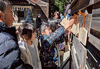 菅原道真公は幼い頃から詩や文学に優れ「学問の神様」として人々から広く尊敬を集めている。祈願祭では子どもたちに、道真公が5歳の時に梅の花を見て詠んだ「うつくしや紅の色なる梅の花 あこが顔にもつけたくぞある」と描かれた絵馬が配られた。子どもたちは絵馬の裏に「勉強を頑張りたい」など、それぞれの願いを心を込めて書いた。羽田浩一宮司による神事では成就を願い、絵馬を手に神妙な顔で頭を下げていた。 |