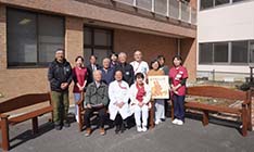 うさぎさんが作った椅子を巡り、優しさや思いやりの心がつながっていく名作絵本「どうぞのいす」。この物語をイメージし、誰もが自由に腰掛けられるベンチをDIYして、憩いの場所を提供する「ALPおっさんどうぞのベンチ<vロジェクト」が昨年から進んでいる。24日は市立大町総合病院に、26日は大町市内の名店街に初の寄贈を行った。利用者の会話と笑顔が生まれ、優しさのバトンが広がっている。