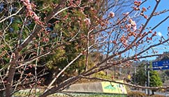 大町市八坂上篭の国道19号沿いにある赤土ポケットパークで、神奈川県南足柄市から贈られた「春めき桜(足柄桜)」の開花が始まった。ソメイヨシノに先駆けて、桜の花のシーズン到来を告げている。