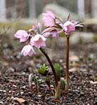 チベタヌスは中国・四川省原産で、120年間消息不明だった種が1980年代後半に再発見された希少な原種。28日の時点では2株ほどが咲いており、うつむくように咲く淡いピンクの透けるような花弁が清楚だ。 |