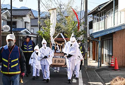 白装束で市神様引き回し=@2月1日まで「池田あめ市」