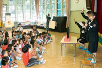 女性団員5人のうち、五十嵐康子班長、太田佳代、深澤伽珠子両団員の3人が参加。活動していた読み聞かせサークルなどでの経験を生かし、手作りの紙芝居や面白いクイズで、消防団の仕事や火遊びの危なさなどを園児にわかりやすく伝えた。 |
