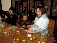「萬物作」の書が掲げられたテーマ展示館社会科教室では、振る舞われた甘酒を県外から訪れた人も囲炉裏でゆっくりと味わった。すごろくや福笑いをお母さんから教わりながらする家族連れ、たこ揚げで昔鍛えた腕を披露するお年寄りや、羽子板ラリーをする年配の女性などそれぞれ笑顔で楽しんでいた。 |