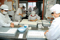 9日は会員21人が同所に集まり、男性4人が135`のもち米を30回に分けてつき上げた。女性会員は延ばして切ったもちを白い和紙に包み、10個ずつひもで結んで1連にする作業に取り組んだ。 保存食としてだけでなく、離乳食や病気のときの流動食などにも利用され、昔を懐かしむ中高年者を中心に人気を集めている。 |