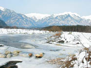 この冷え込みで、同市西部を流れる高瀬川は、流れの緩やかな場所では、川全体が氷に覆われた。市街地と常盤方面を結ぶ観音橋付近では、水面が氷に覆われた光景が見られた。 |
