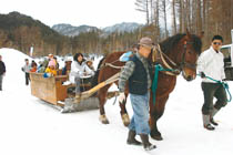 入り口のメーン会場は子どもに人気の馬そり体験やもちつきなどでにぎわい、地元清水地区のそばや汁粉などが振る舞われ、来場者を歓迎した。 |