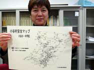 通学路上の危険か所を学校と家庭が共通理解することで、協力して子どもたちの安全対策に取り組める体制づくりをめざす企画。マップは村農林課の協力を得て、子どもたちの通学路を中心に、平成18、19年度のクマの捕獲か所、19年度における目撃か所をクマのイラストと丸印で記載している。 |