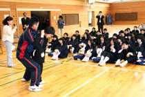 大町署生活安全刑事課や八坂駐在所の署員が講師を務め、万が一不審者や暴漢に襲われた場合の対処法を指導。後ろから羽交い締めにされた場合や、前から手をつかまれた場合に振りほどく方法などを教え、生徒たちも実演で体験した。 |