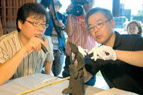 日韓共同で歴史調査 松川の国重文銅造菩薩半跏像 日本最古の渡来仏のひとつといわれている松川村の金福山観松院(永竜清隆〈ながたき・せいりゅう>住職)に祭られている国重要文化財の仏像「銅造菩薩半跏(はんか)像」から見て取れる日韓の歴史的関係などについて日韓両国の研究者により29日、同寺本堂で調査が行われた。韓国国立抹餘(ぷよ)博物館所蔵の「抹餘夫蘇山(ぷよぷそさん)賛石製半跏思惟像」の様相と良く似ているという同寺の仏像が、当時の百済(くだら)で造られ、持ち込まれたものか、日本で造られたものかなど未解明な部分が多い。普段は非公開で、収納庫・厨子(ずし)にしまわれている仏像を一日がかりで調査した。 |